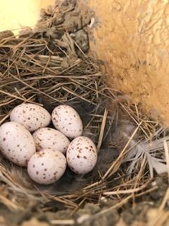 毎年同じ巣を利用しているので、既に卵が6個産み付けられてました。親ツバメがいないうちに携帯を使って確認しました。(笑)