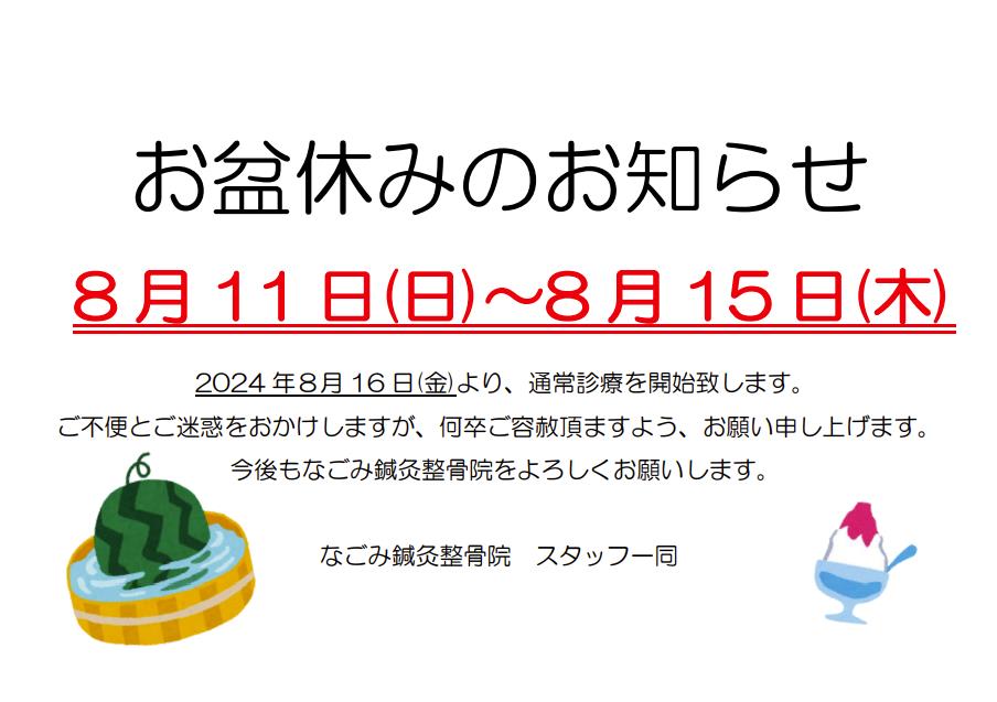 8月11日~8月15日までお盆休みとさせていただきます。8月16日(金)より、通常診療を開始いたします。ご不憫とご迷惑をおかけしますが、何卒ご容赦いただきますよう、お願い申し上げます。今後もなごみ鍼灸整骨院をよろしくお願いします。 なごみ鍼灸整骨院 スタッフ一同