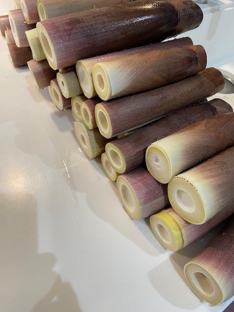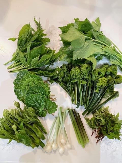 ミツバ、アシタバ、ユキノシタ、コゴミ、タラの芽、ノビル、茎ミョウガ、サンショが採れました。