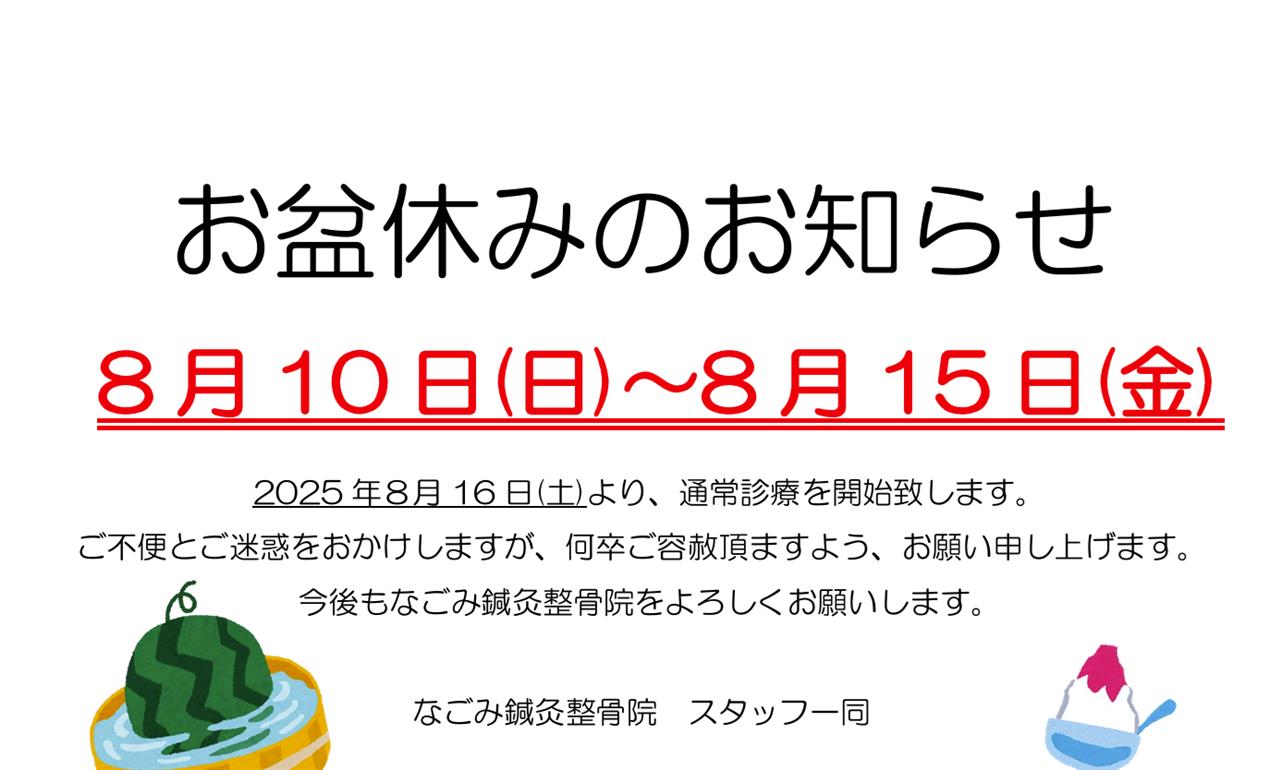 お盆を過ぎても酷暑が続きます。ついつい冷たい食べ物・飲み物に手が伸びてしまいます(;・∀・)胃腸が冷えると疲れやすくなり、寝付きもわるく風邪も引きやすくなります。そんな時は、お灸で身体の芯から温めるのが効果的です。当院ではもぐさが直接皮膚に触れない台座灸を使用していますのでやけどの心配もありません。ぜひ試してみてくださいね(*^。^*)