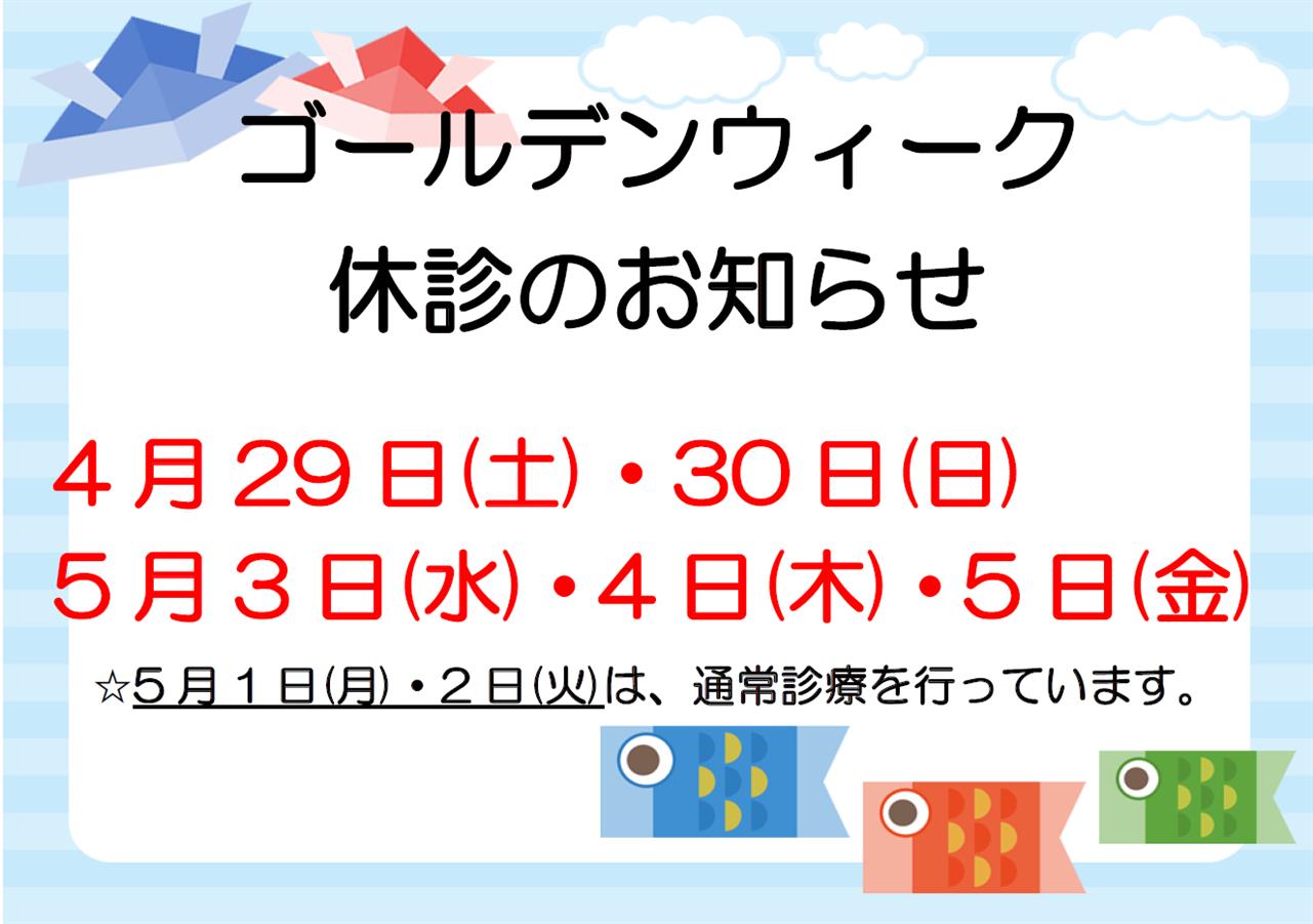暦どおり日曜・祝日はお休みとさせていただきます。また5月1日(月曜)5月2日(火曜)5月6日(土曜)は通常通り診療しております。