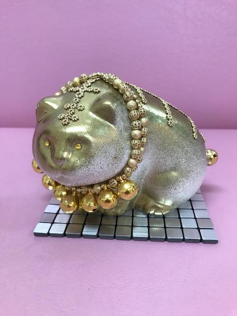 今年も知り合いの保育士さんから頂いたトラの陶器に装飾してみました。まずは白のスプレーを全体に吹きかけ、乾燥してから金のスプレーで再度色を施し、ダイソーで購入した金の鈴や小物、台座。合計600円でデコってみました。招き猫ならぬ招き寅の完成です。また当院の玄関に飾ってあるので見てくださいね!