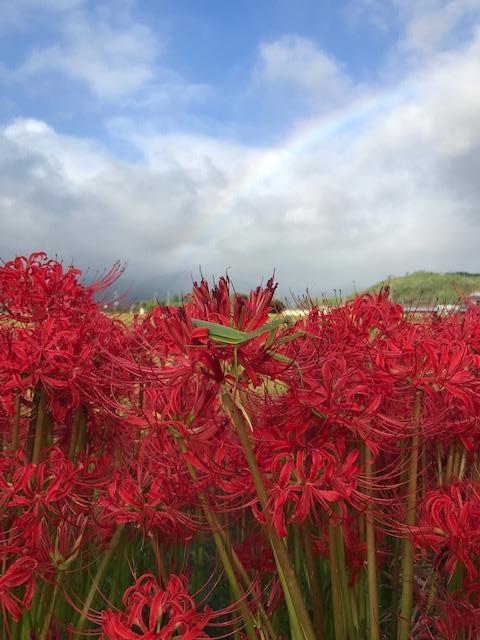 本日の午後、彼岸花を見に行ってきました。丁度雨上がりだったので、🌈が出ており彼岸花も見頃で、大勢の方が来られていました。撮れた写メを拡大したら、たまたまカマキリも映ってました。