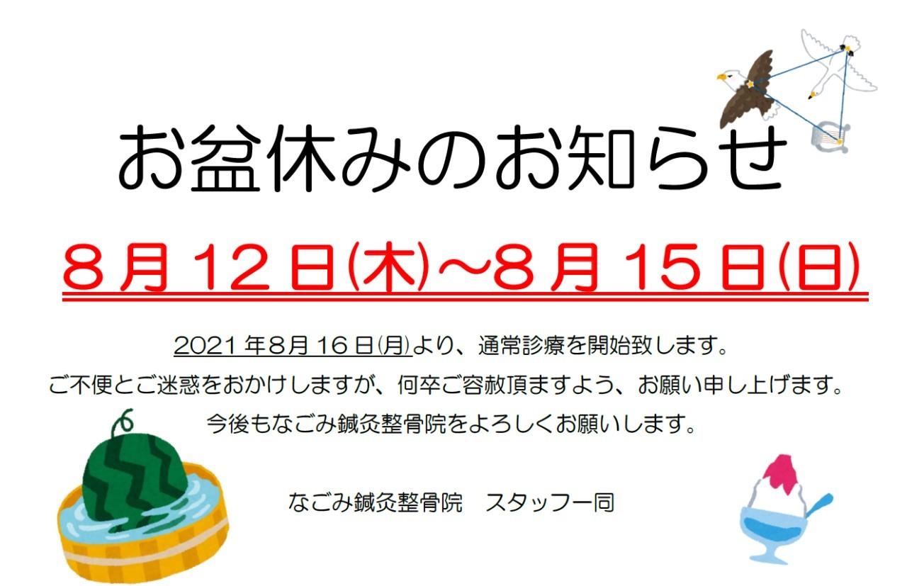 8月12日(木)~8月15日(日)までお盆休みとさせていただきます。8月16日(月)から通常診療を開始いたします。