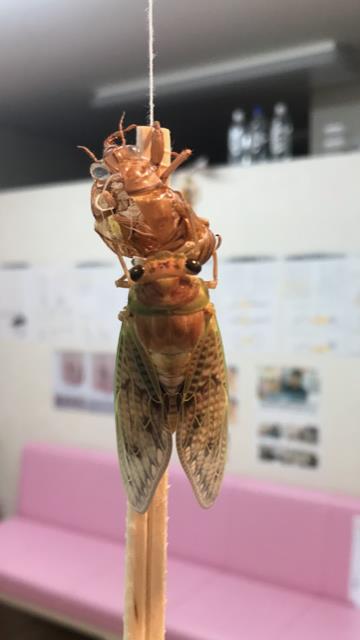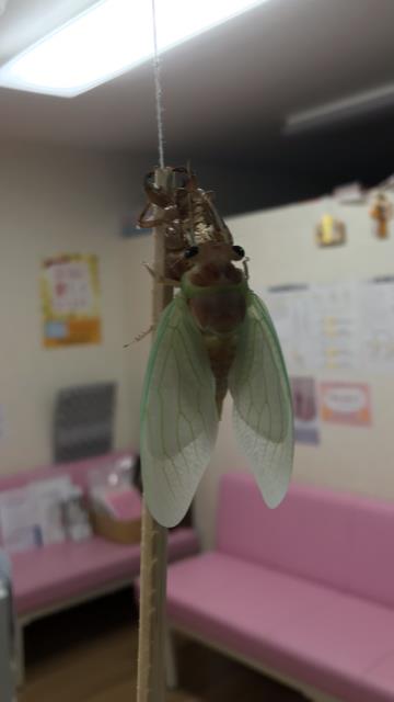 PM11時45分。随分と体の色が濃くなってきました。朝までには完全に飛び立って、治療院の中で何処に行ったか避ける為に、この時点でサナギを見つけた街路樹に戻しておきました。朝確認したら何処かへ飛んで行っていませんでした。なかなか神秘的な瞬間を目撃できて楽しかったです。ちなみにサナギはアブラゼミでした。