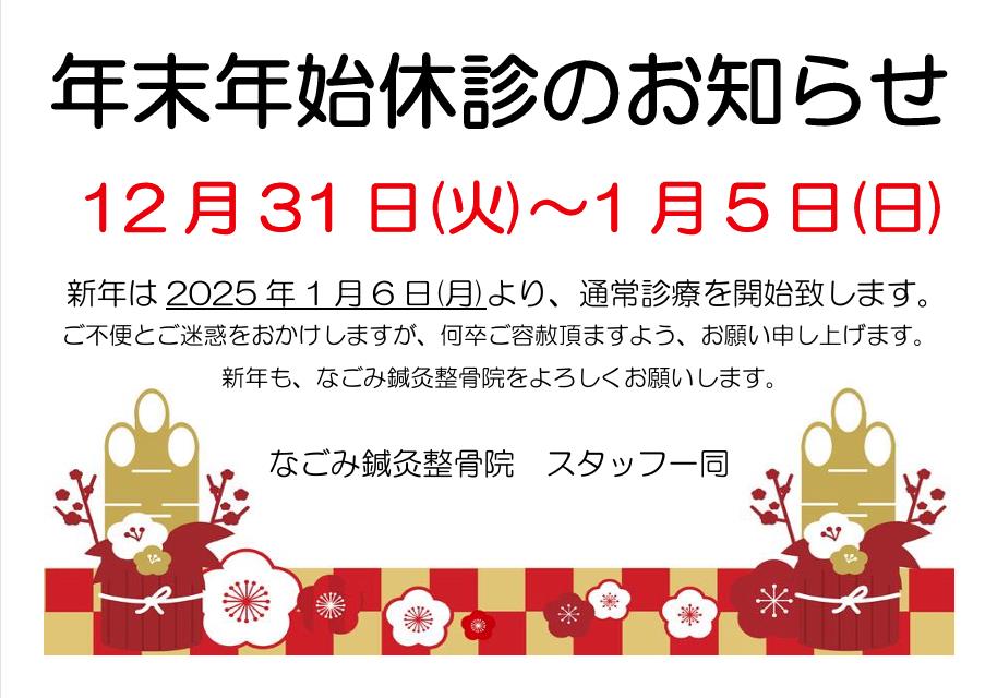 2024年12月31日(火)~ 2025年1月5日(日)は休診とさせていただきます。新年2025年1月6日(月)より通常診療を開始致します。皆さまにはご不便とご迷惑をおかけしますが、よろしくお願い致します。