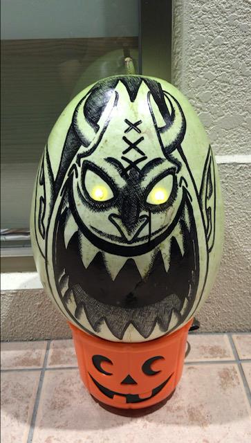 更にキャラクターの両目にLEDライトを内蔵して、治療院前に展示しております(^o^)10月31日ハロウィンまで置いてますので、良かったら見に来て下さいね。