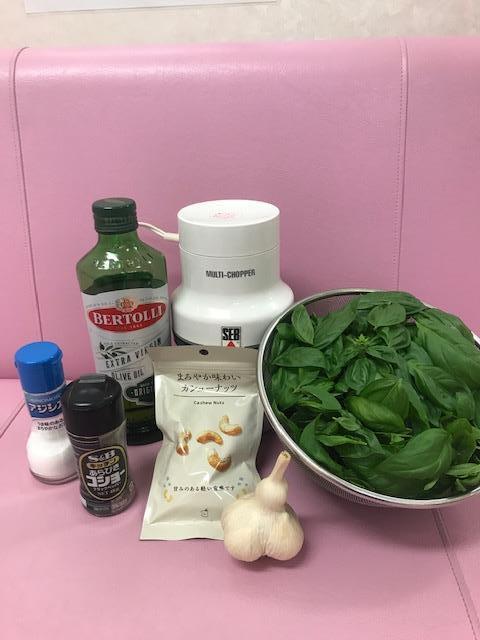 材料はバジルの葉、ニンニク、カシューナッツ、オリーブオイル、塩、コショウです。